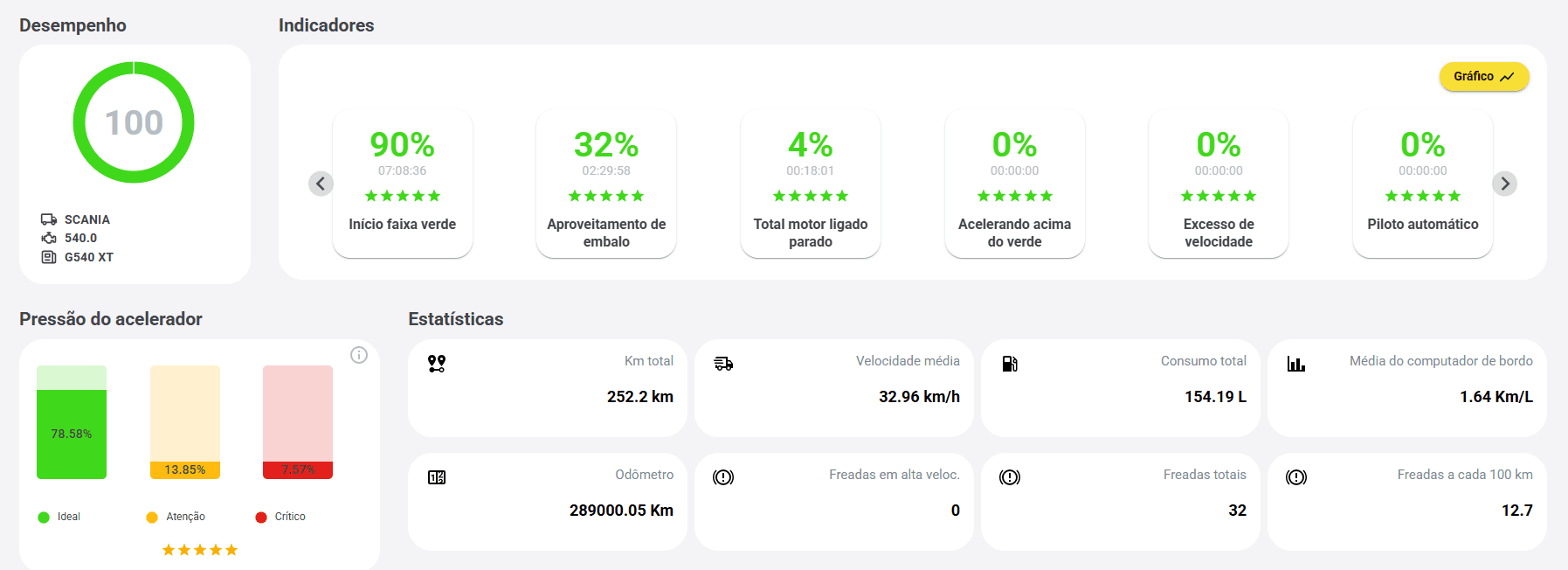 velocidade, frenagens, curvas, RPM, consumo e mais
